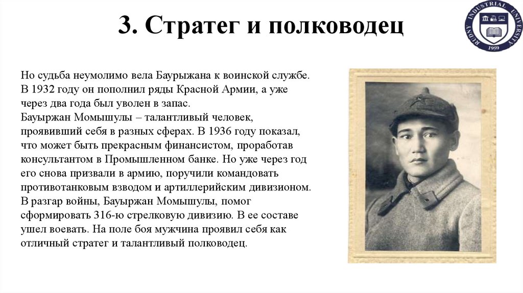 За особые заслуги Бауыржан Момышулы, фото которого есть