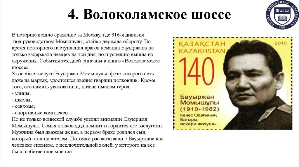 В историю вошло сражение за Москву, где 316-я дивизияпод руководством Момышулы, стойко держала оборону. Во