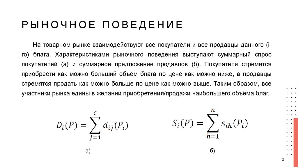 РЫНОЧНОЕ ПОВЕДЕНИЕНа товарном рынке взаимодействуют все покупатели и все продавцы данного (iго) блага. Характеристиками рыночного поведения выступают суммарный спрос