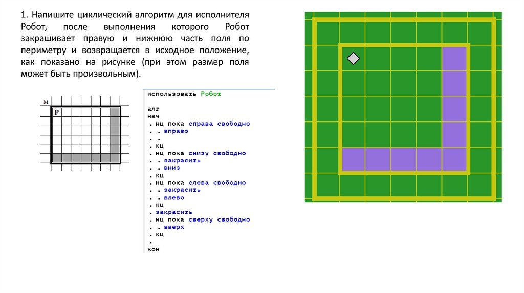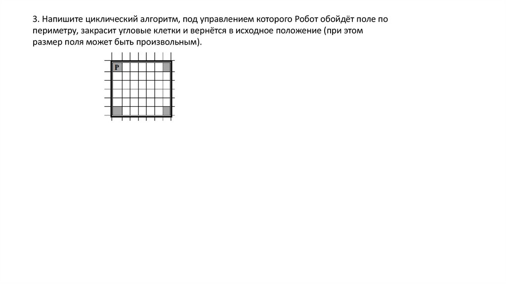 3. Напишите циклический алгоритм, под управлением которого Робот обойдёт поле попериметру, закрасит угловые клетки и вернётся в исходное положение (при этом