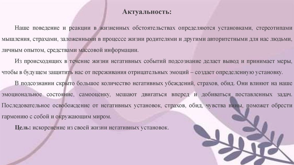 Наше поведение и реакции в жизненных обстоятельствах определяются установками, стереотипамимышления, страхами, заложенными в процессе жизни родителями и другими авторитетными для нас людьми,