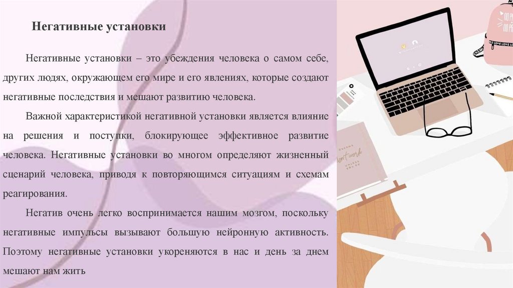 Негативные установки – это убеждения человека о самом себе,других людях, окружающем его мире и его явлениях, которые создают