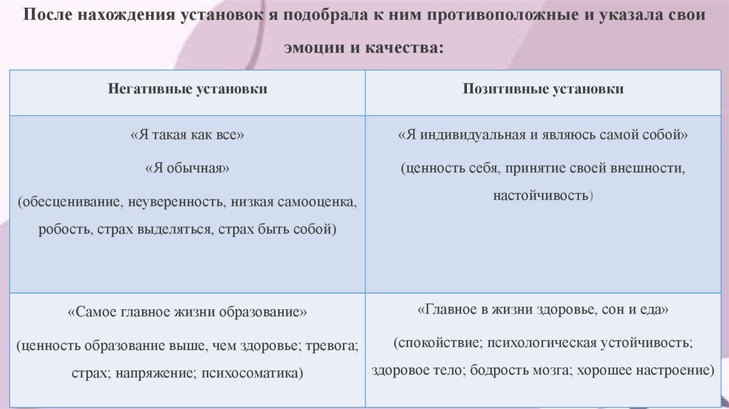 8. После нахождения установок я подобрала к ним противоположные и указала свои эмоции и качества: