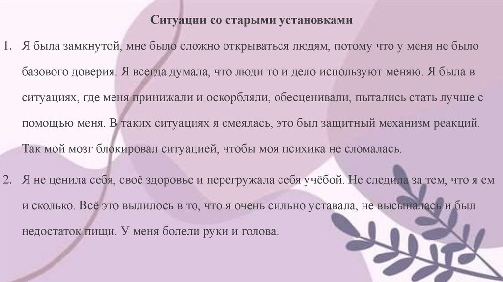 1. Я была замкнутой, мне было сложно открываться людям, потому что у меня не былобазового доверия. Я всегда думала, что люди то и дело используют меняю. Я была в