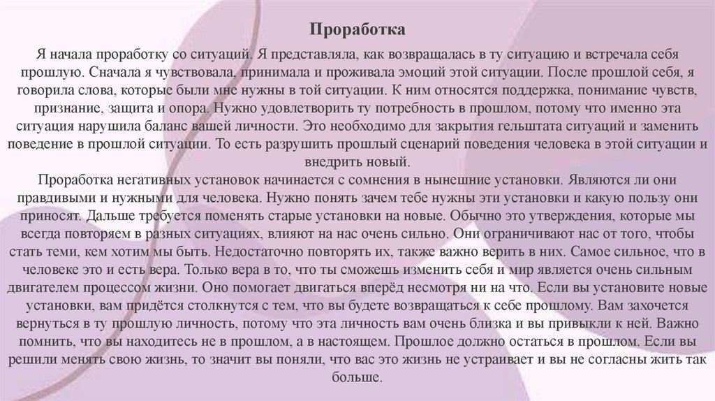 Я начала проработку со ситуаций. Я представляла, как возвращалась в ту ситуацию и встречала себяпрошлую. Сначала я чувствовала, принимала и проживала эмоций этой ситуации. После прошлой себя, я