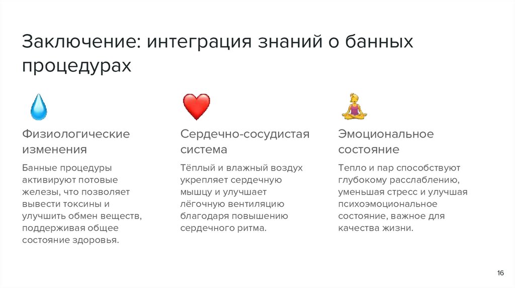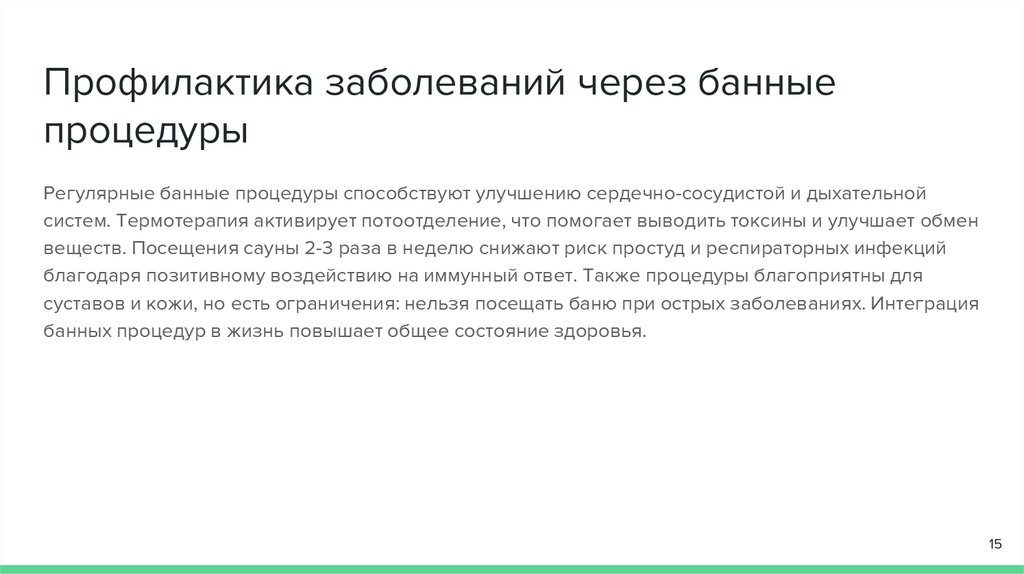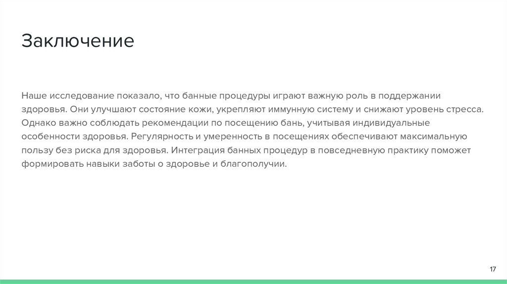 ЗаключениеНаше исследование показало, что банные процедуры играют важную роль в поддержании