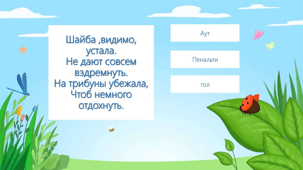 2. Шайба ,видимо, устала. Не дают совсем вздремнуть. На трибуны убежала, Чтоб немного отдохнуть.