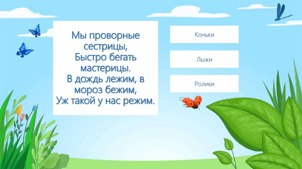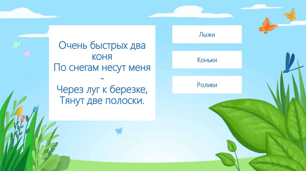 5. Очень быстрых два коня По снегам несут меня - Через луг к березке, Тянут две полоски.