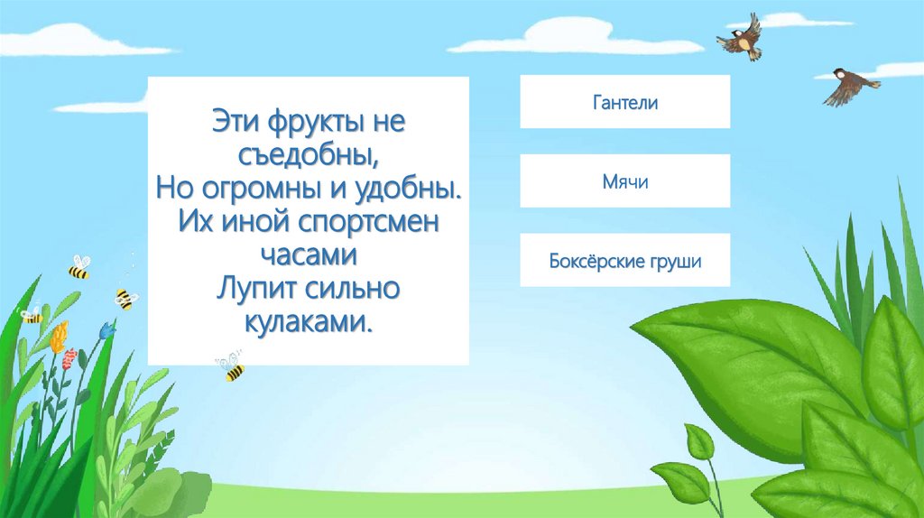 4. Эти фрукты не съедобны, Но огромны и удобны. Их иной спортсмен часами Лупит сильно кулаками.