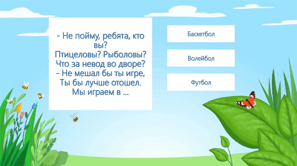 6. - Не пойму, ребята, кто вы? Птицеловы? Рыболовы? Что за невод во дворе? - Не мешал бы ты игре, Ты бы лучше отошел. Мы играем в