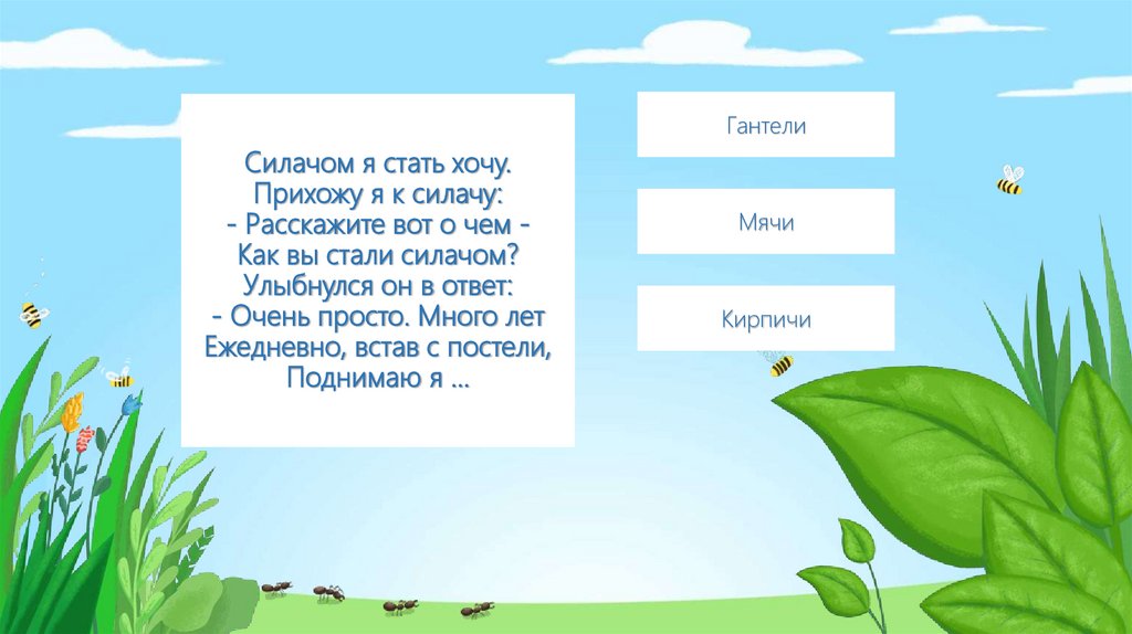 8. Силачом я стать хочу. Прихожу я к силачу: - Расскажите вот о чем - Как вы стали силачом? Улыбнулся он в ответ: - Очень просто.
