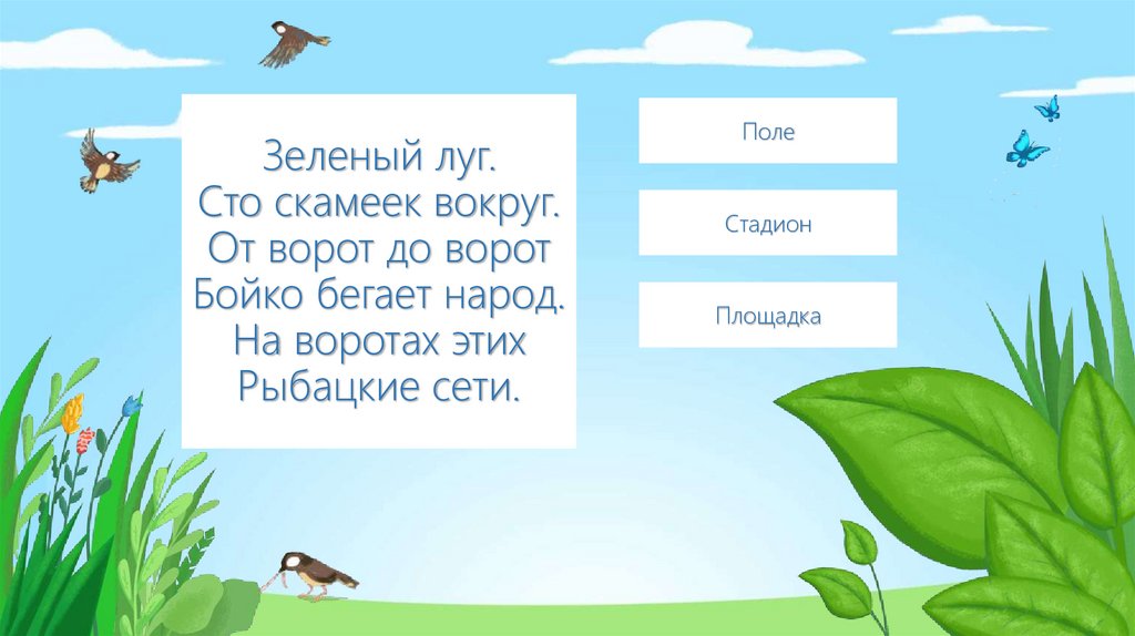 9. Зеленый луг. Сто скамеек вокруг. От ворот до ворот Бойко бегает народ. На воротах этих Рыбацкие сети.