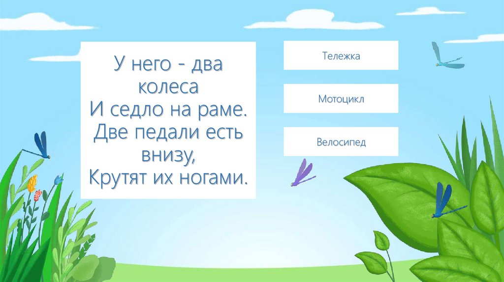 10. У него - два колеса И седло на раме. Две педали есть внизу, Крутят их ногами.