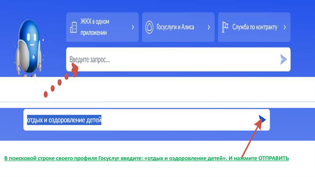 В поисковой строке своего профиля Госуслуг введите: «отдых и оздоровление детей». И нажмите ОТПРАВИТЬ2.