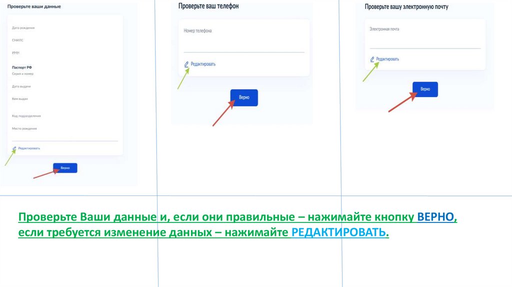 Проверьте Ваши данные и, если они правильные – нажимайте кнопку ВЕРНО,если требуется изменение данных – нажимайте РЕДАКТИРОВАТЬ.