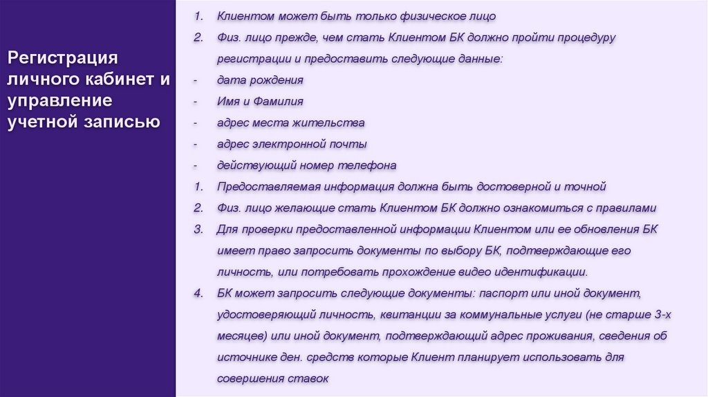 Физ. лицо прежде, чем стать Клиентом БК должно пройти процедуру