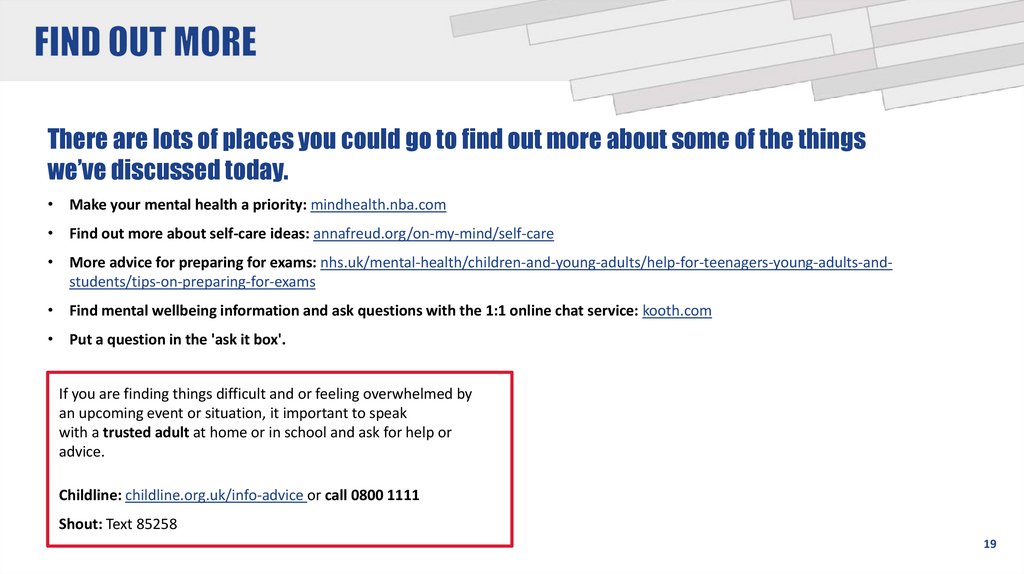 • More advice for preparing for exams: nhs.uk/mental-health/children-and-young-adults/help-for-teenagers-young-adults-andstudents/tips-on-preparing-for-exams