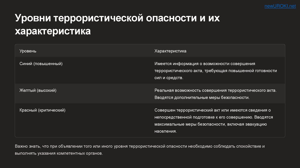 Важно знать, что при объявлении того или иного уровня террористической опасности необходимо соблюдать спокойствие и