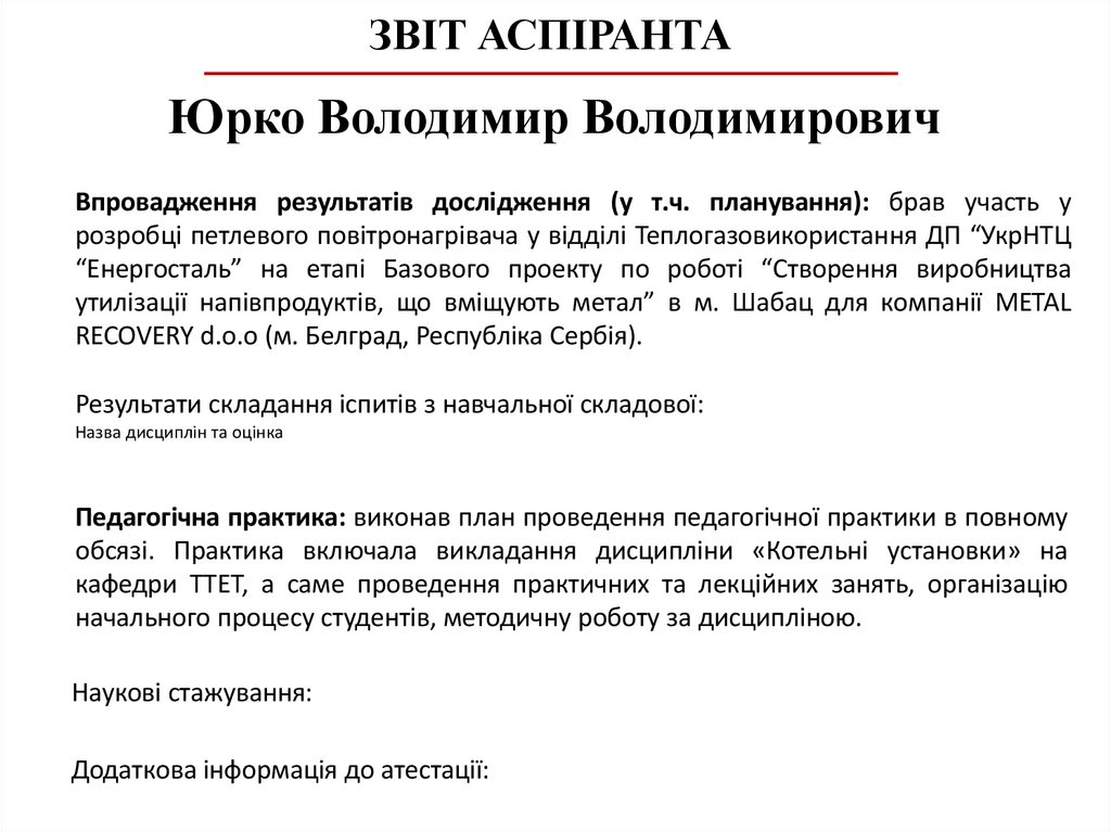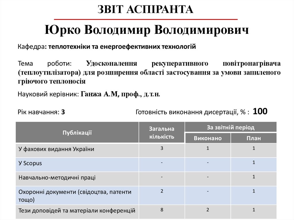 ЗВІТ АСПІРАНТАЮрко Володимир Володимирович