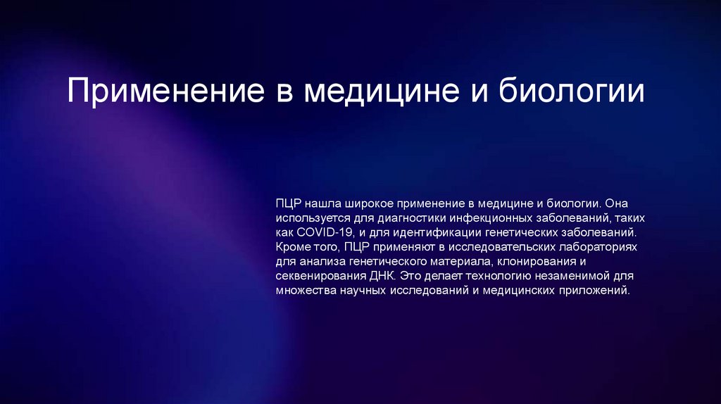 Применение в медицине и биологииПЦР нашла широкое применение в медицине и биологии. Она