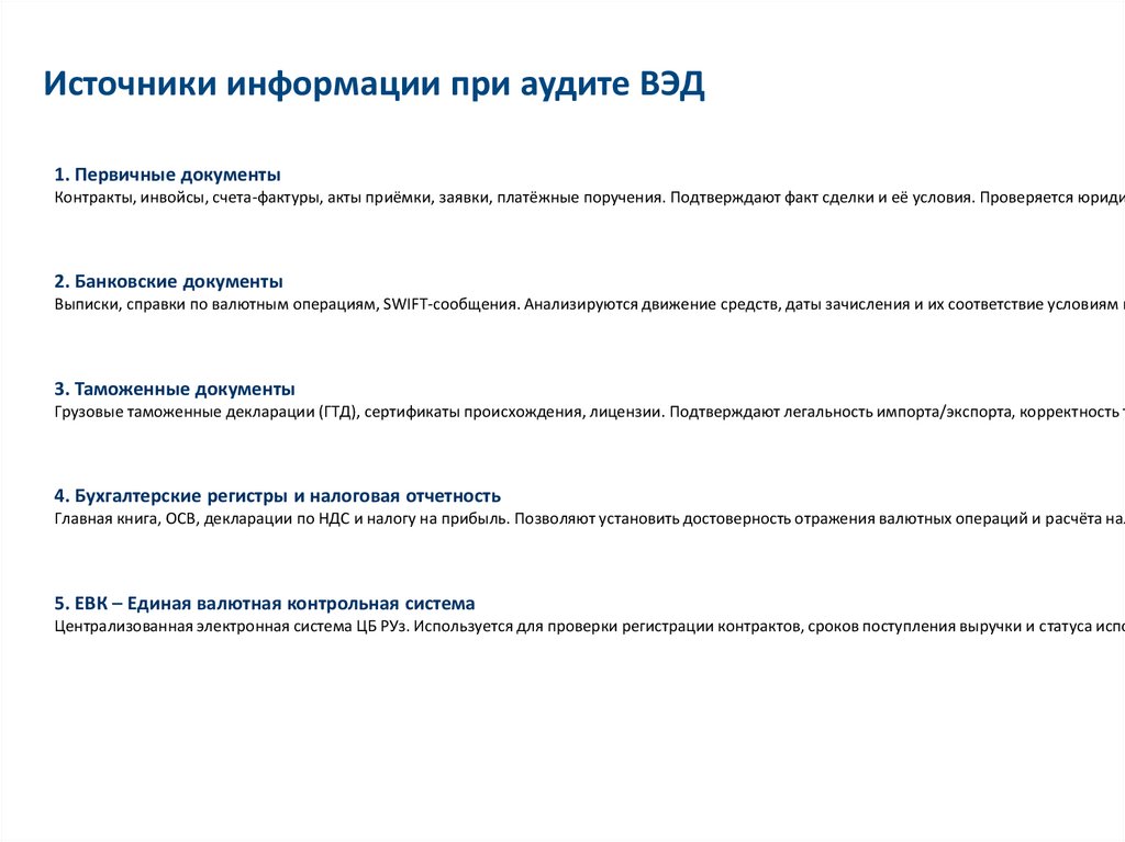 Главная книга, ОСВ, декларации по НДС и налогу на прибыль. Позволяют установить достоверность отражения валютных операций и расчёта нал