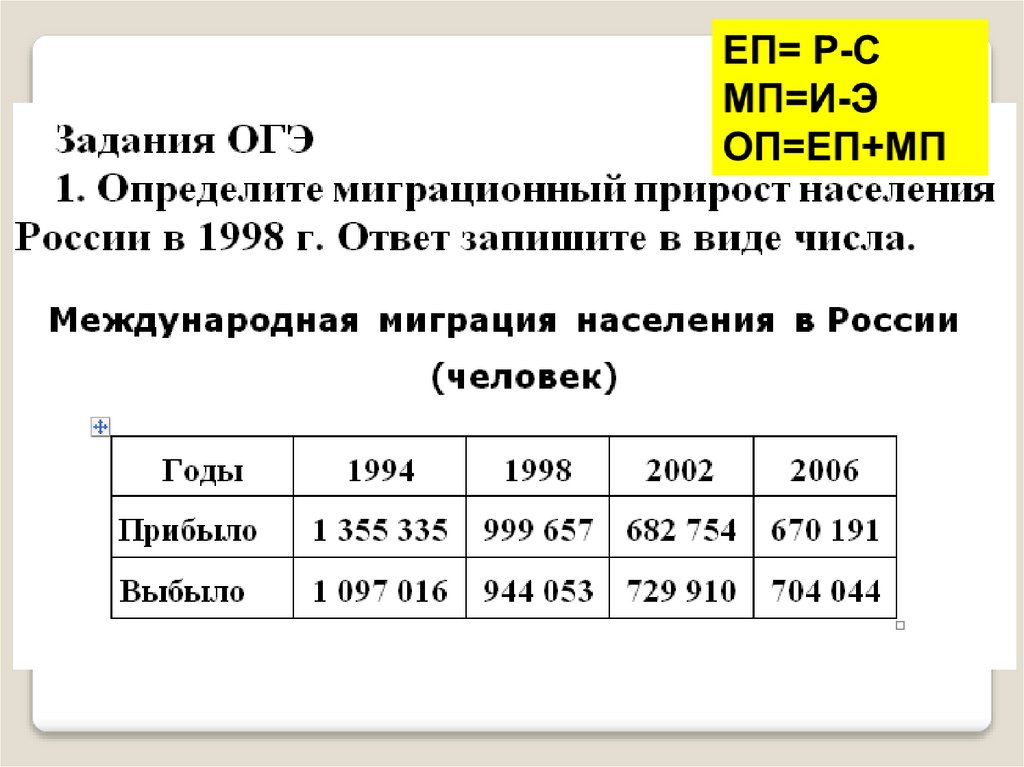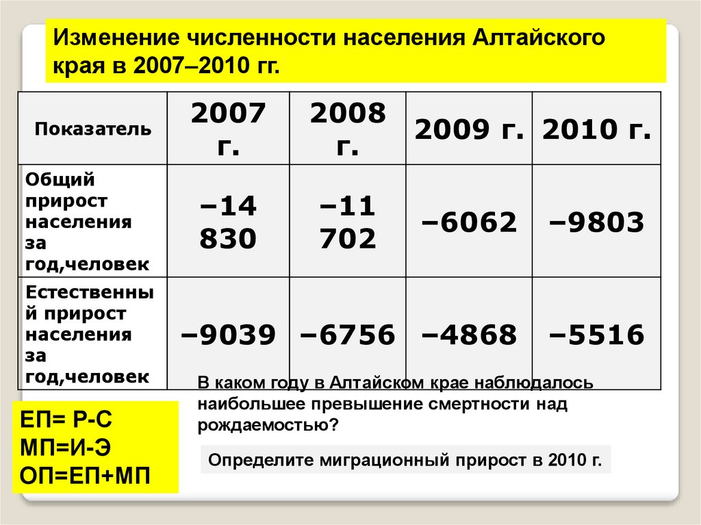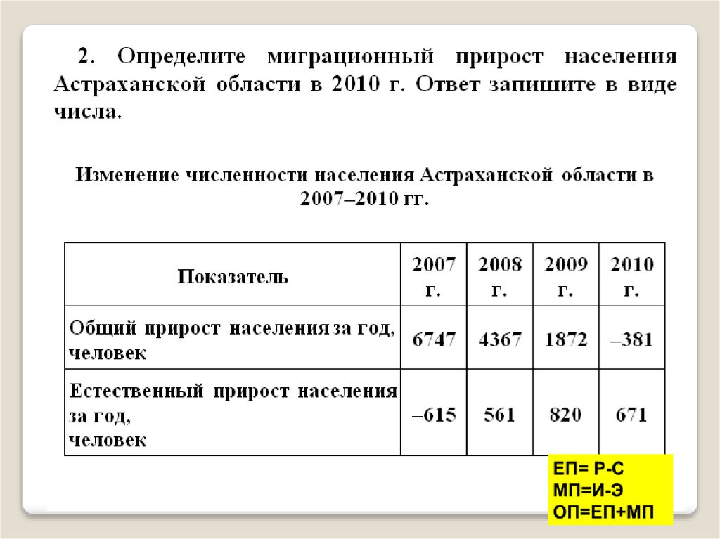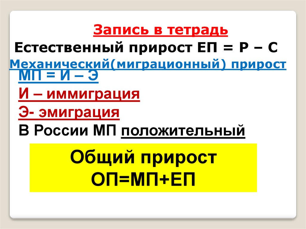Запись в тетрадьЕстественный прирост ЕП = Р – С