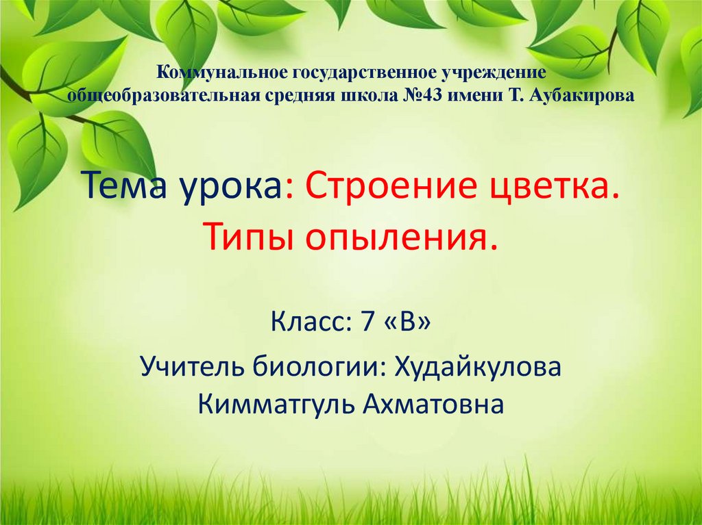 1. Коммунальное государственное учреждение общеобразовательная средняя школа №43 имени Т. Аубакирова Тема урока: Строение цветка.
