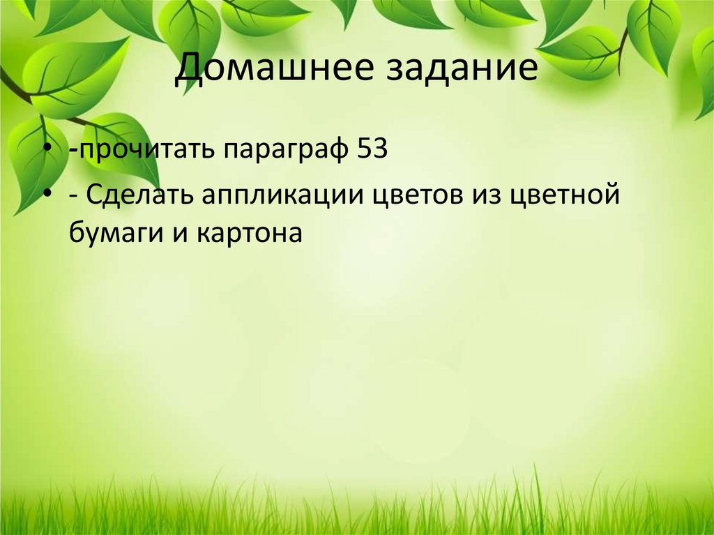 • -прочитать параграф 53• - Сделать аппликации цветов из цветной