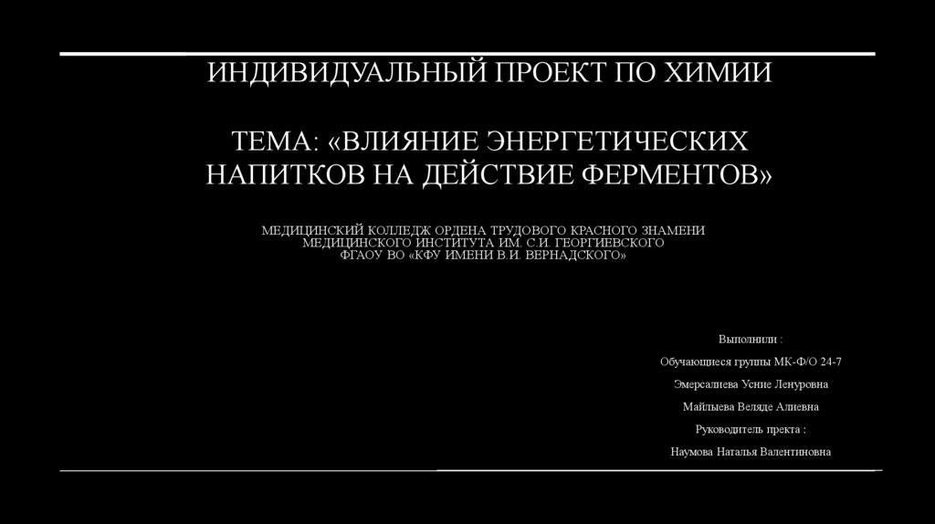 1. Индивидуальный проект по химии Тема: «Влияние энергетических напитков на действие ферментов»
