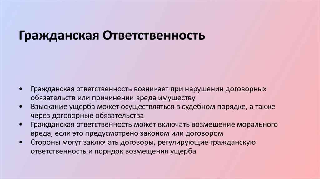 Гражданская ОтветственностьГражданская ответственность возникает при нарушении договорных