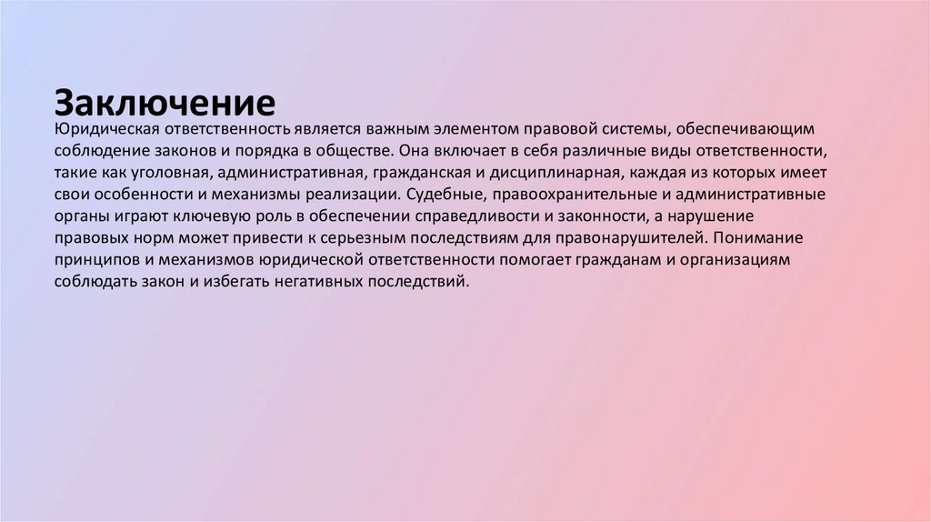 ЗаключениеЮридическая ответственность является важным элементом правовой системы, обеспечивающим