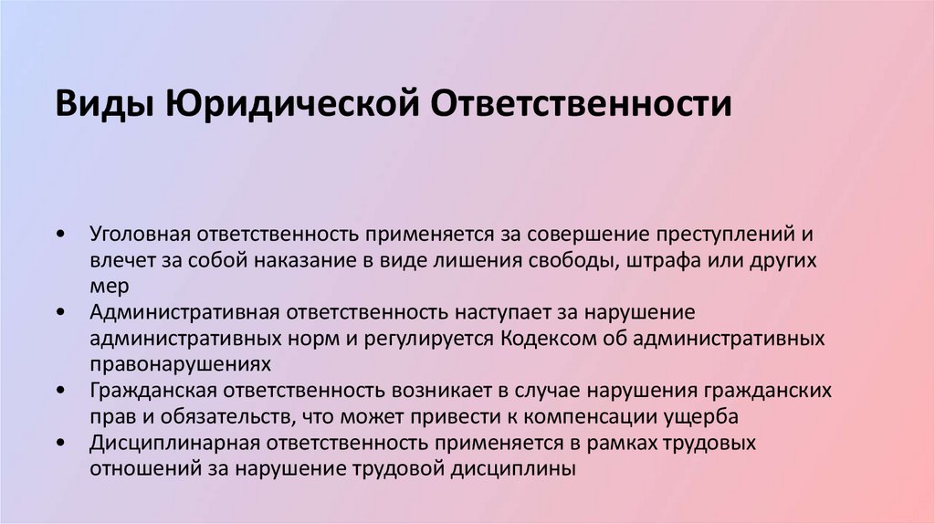 такие как уголовная, административная, гражданская и дисциплинарная, каждая из которых имеет