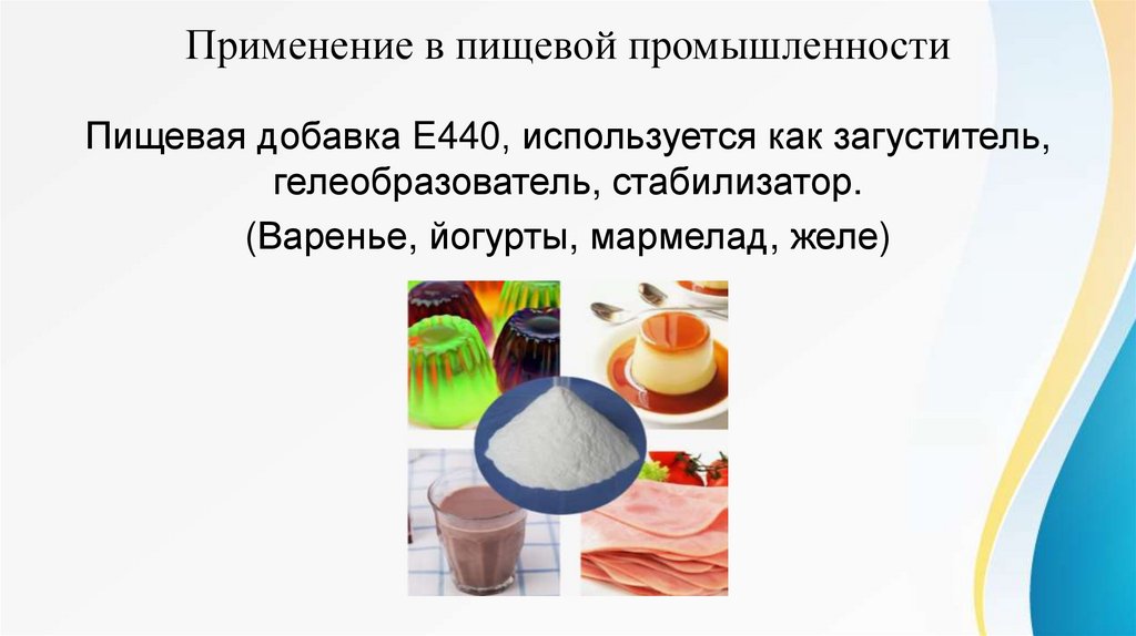 Применение в пищевой промышленностиПищевая добавка E440, используется как загуститель,