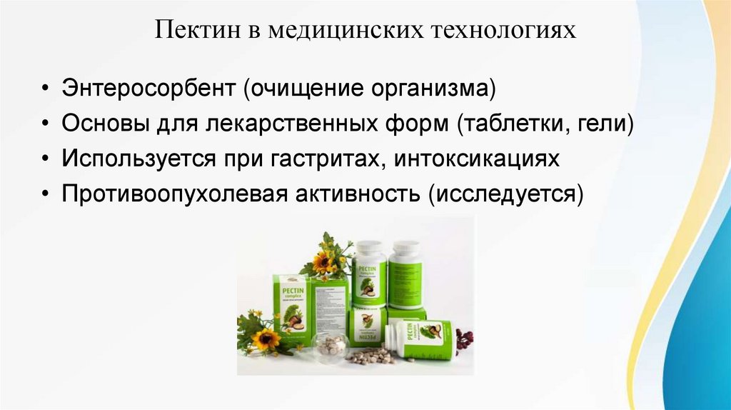 Пектин в медицинских технологиях• Энтеросорбент (очищение организма)