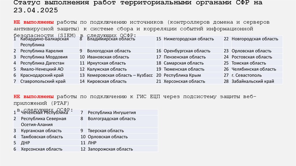 Статус выполнения работ территориальными органами СФР на23.04.2025