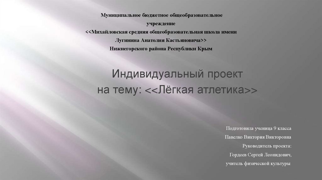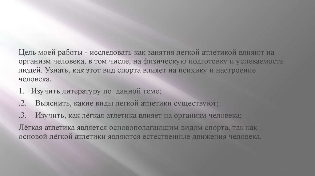 Цель моей работы - исследовать как занятия лёгкой атлетикой влияют наорганизм человека, в том числе, на физическую подготовку и успеваемость