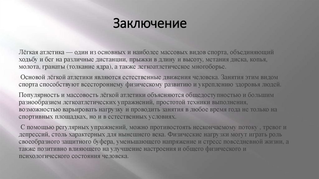 ЗаключениеЛёгкая атлетика — один из основных и наиболее массовых видов спорта, объединяющий