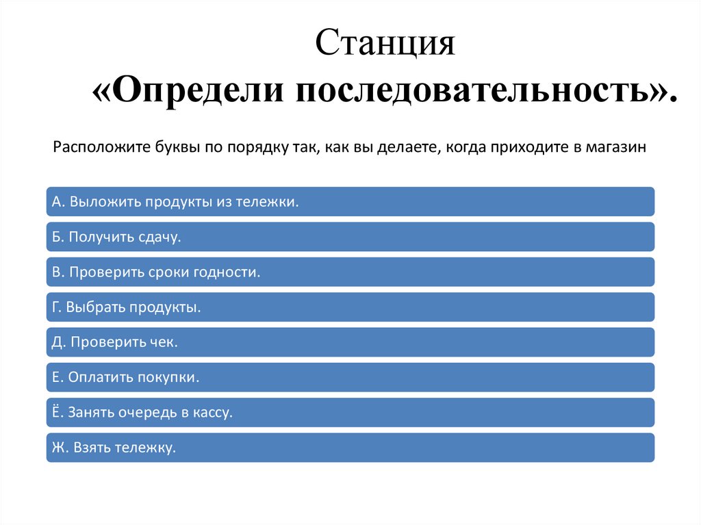 Расположите буквы по порядку так, как вы делаете, когда приходите в магазинA. Выложить продукты из тележки.