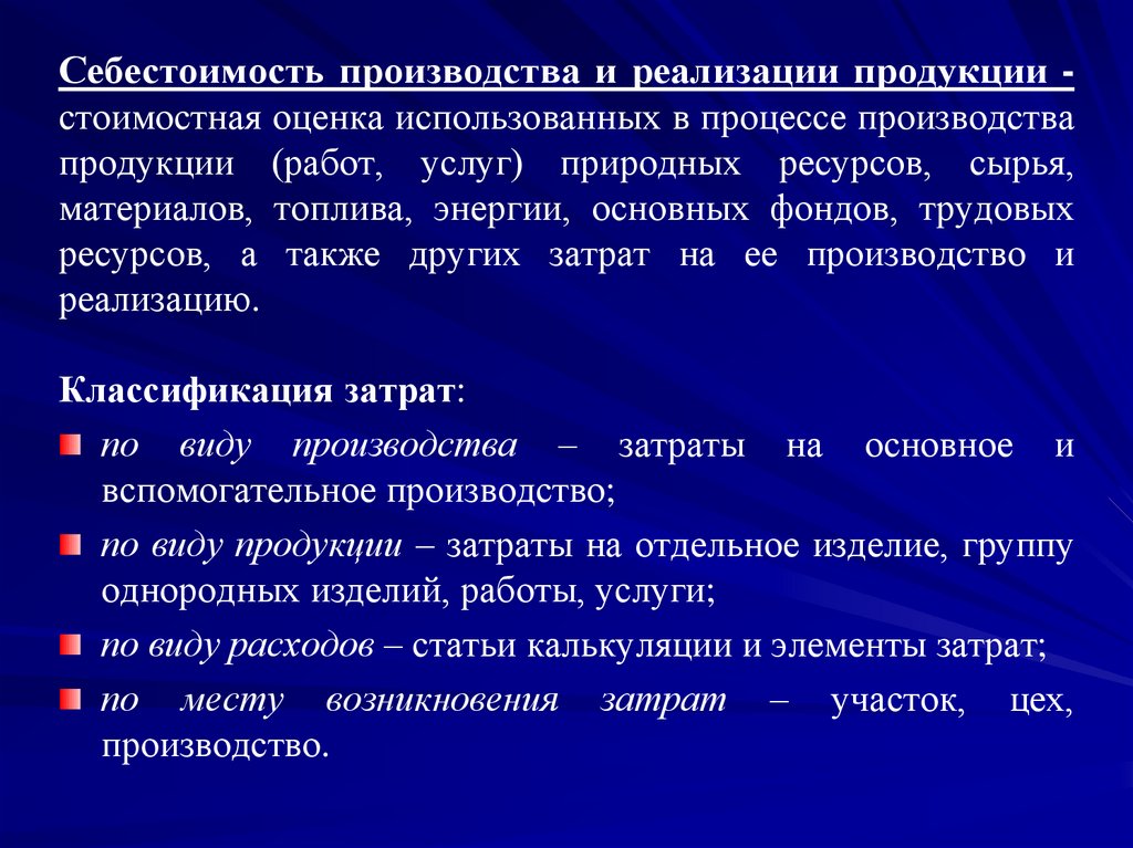 Себестоимость производства и реализации продукции стоимостная оценка использованных в процессе производствапродукции (работ, услуг) природных ресурсов, сырья,