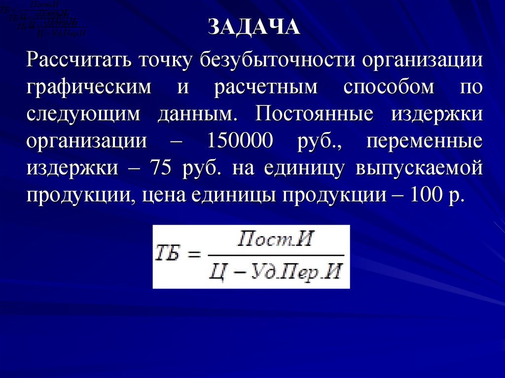 График безубыточности продукцииТБ – точка безубыточности (показывает, при каком объеме производства у