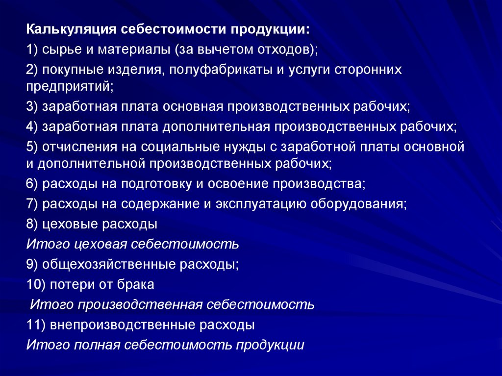 Калькуляция себестоимости продукции:1) сырье и материалы (за вычетом отходов);