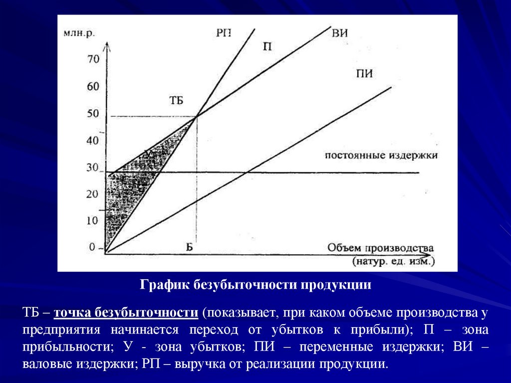 прибыльности; У - зона убытков; ПИ – переменные издержки; ВИ –