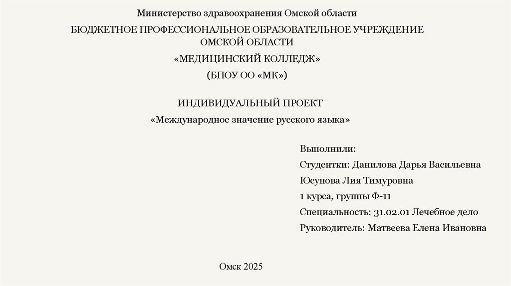 Министерство здравоохранения Омской областиБЮДЖЕТНОЕ ПРОФЕССИОНАЛЬНОЕ ОБРАЗОВАТЕЛЬНОЕ УЧРЕЖДЕНИЕ