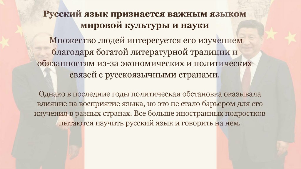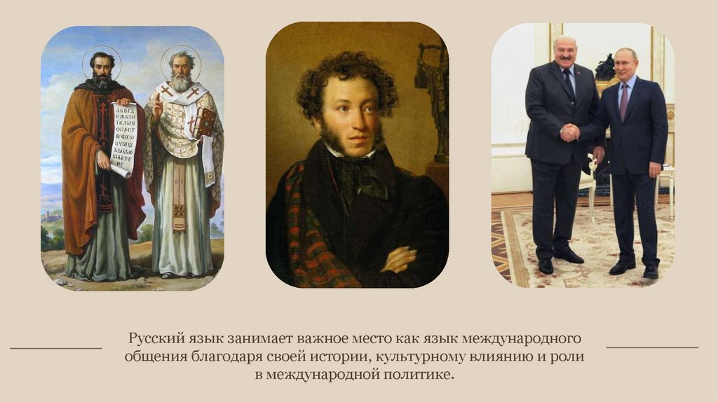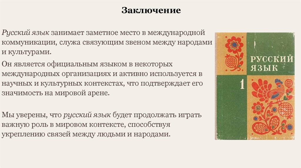 Русский язык занимает важное место как язык международногообщения благодаря своей истории, культурному влиянию и роли