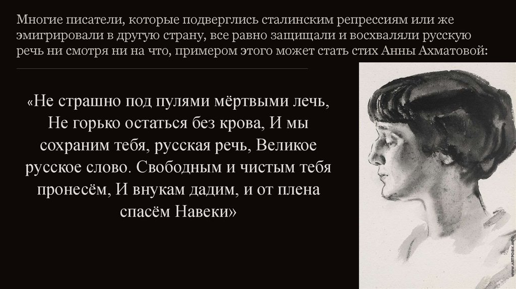 Многие писатели, которые подверглись сталинским репрессиям или жеэмигрировали в другую страну, все равно защищали и восхваляли русскую