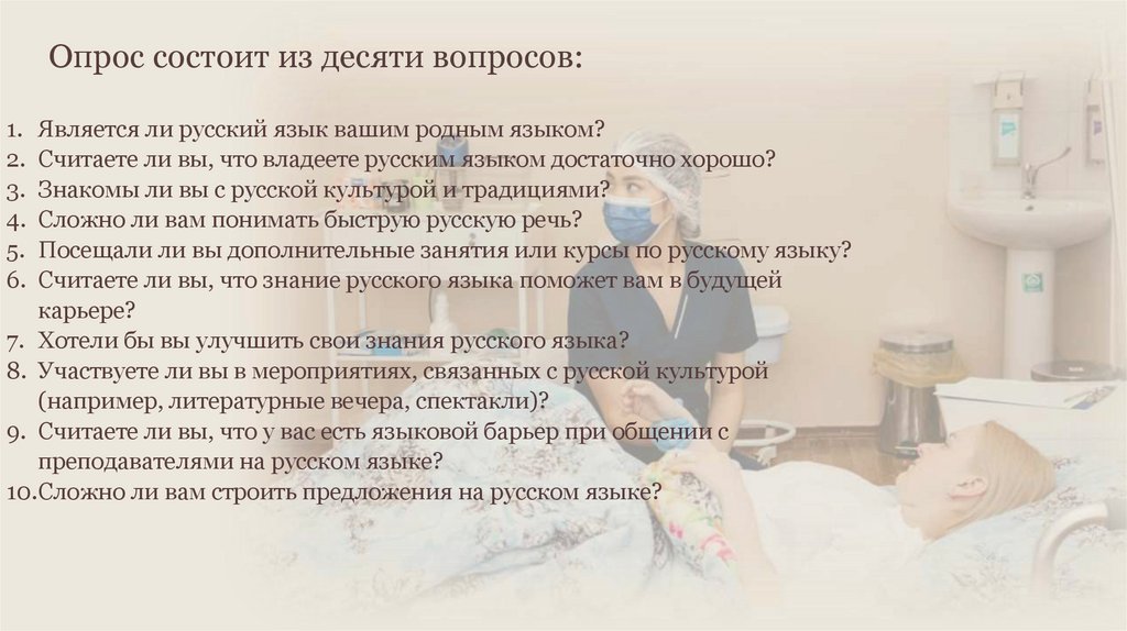 Опрос состоит из десяти вопросов:1. Является ли русский язык вашим родным языком?