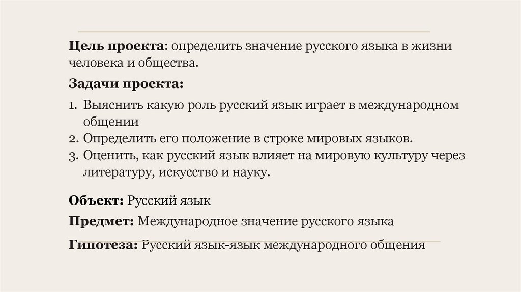 Цель проекта: определить значение русского языка в жизничеловека и общества.