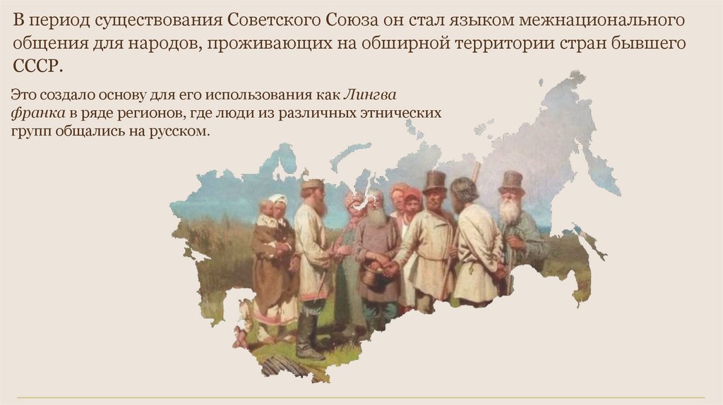 В период существования Советского Союза он стал языком межнациональногообщения для народов, проживающих на обширной территории стран бывшего
