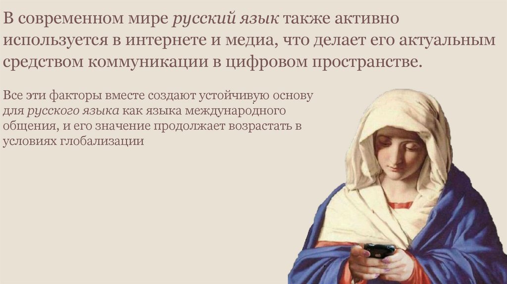В современном мире русский язык также активноиспользуется в интернете и медиа, что делает его актуальным