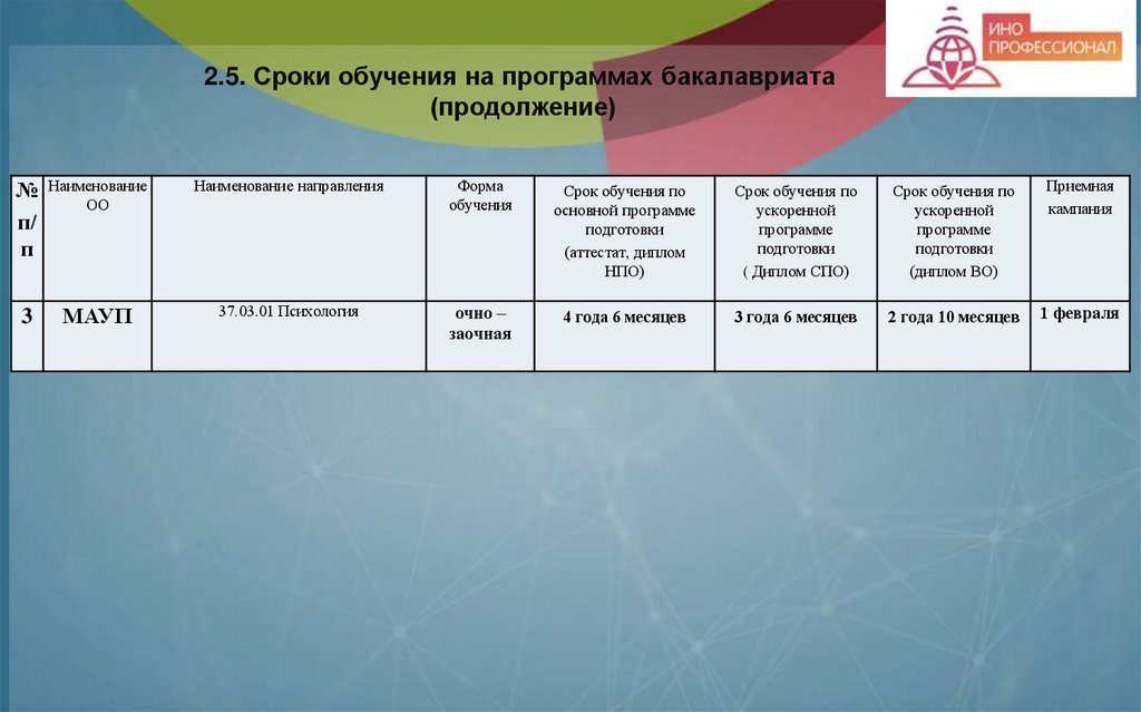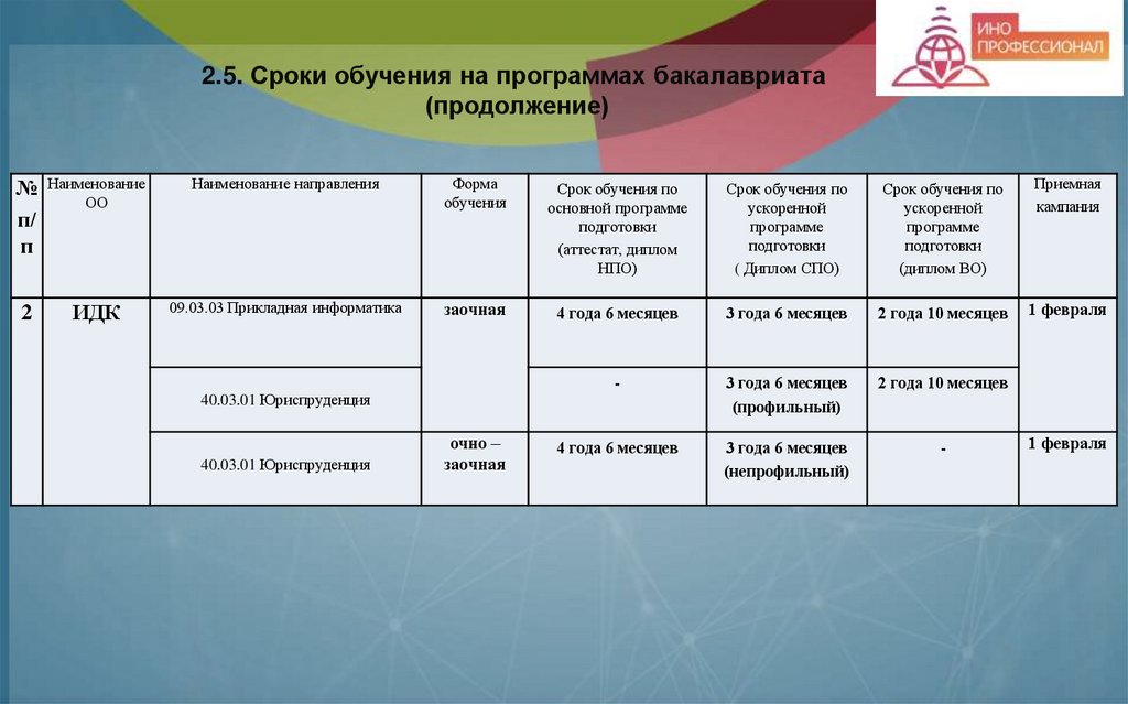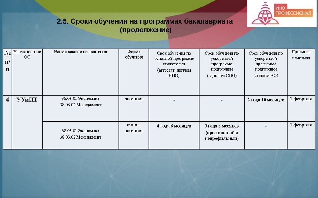 2.5. Сроки обучения на программах бакалавриата (продолжение)№ Наименование